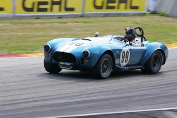 As for the look, my general guide is CSX 3032, a 427 built for racing. The roadster is Guardsman Blue with Wimbledon White stripes. There is no chrome but black paint or powder coating; it has a competition windscreen. I like the darker color of the wheels.