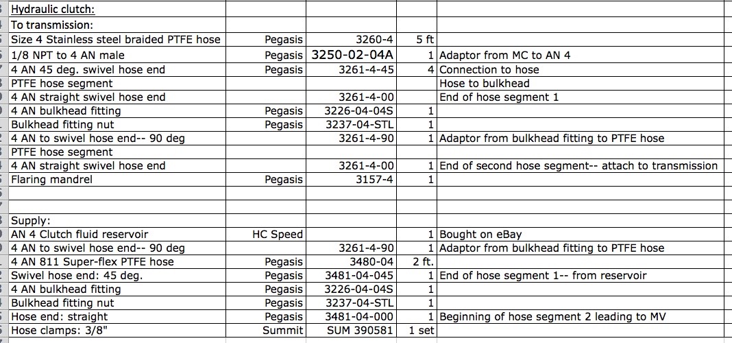 The table below lists the fittings for the supply and transmission segments of the setup. Note: 1) all fittings are AN 4; 2) the supply and hydraulic clutch ‘sides’ use different PTFE hose. Both are for use with hydraulic fluids but the 3260-4 hose is for high pressure use.